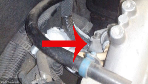 - На топливной рампе найдите штуцер, который используется для контроля давления. Он выглядит как ниппель на камере автомобильной шины. (Либо снимите шланг, который подает топливо от бензонасоса к рампе).