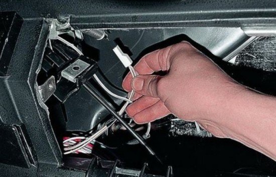 Далее отсоединяем две клеммы, которые питают лампочки освещения в бардачке.