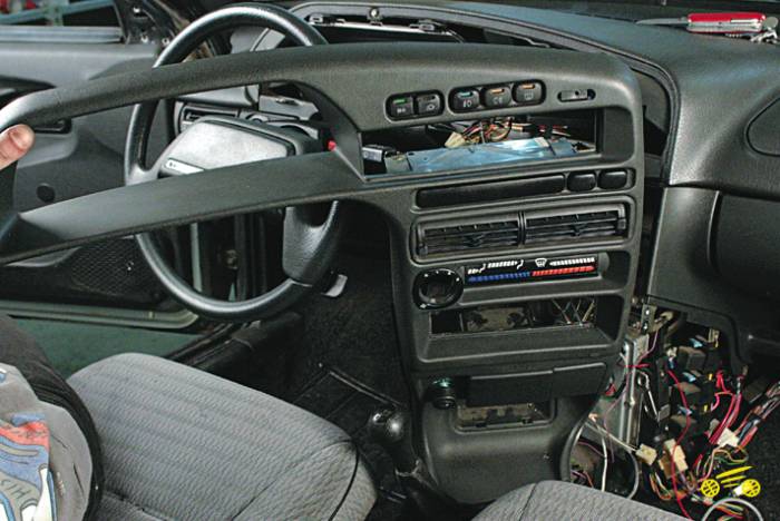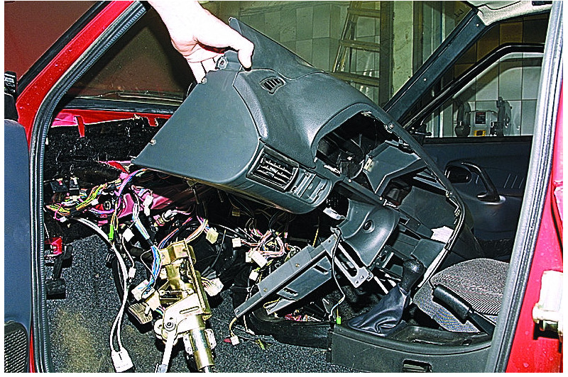 Прежде всего, отключите электрическую цепь. Для этого отсоедините «плюсовую» клемму аккумулятора. Далее следуйте следующему порядку действий при демонтаже:* С левой стороны консоли, со стороны водителя, снимите боковую накладку. Для этого открутите пять саморезов и аккуратно извлеките деталь. Аналогичные действия выполните и со стороны пассажирского сидения. Затем отсоедините разъемы, которые идут к магнитоле, прикуривателю, пепельнице и их подсветке.* Теперь необходимо извлечь рукоятку выключателя печки. Подденьте ее отверткой и потяните на себя. То же самое сделайте с рукоятками управления заслонкой. Все мелкие детали лучше всего положить в контейнер, чтобы избежать их потери.1. Далее открутите саморезы на щите приборов. Два из них находятся сверху, а два других – снизу. Удобнее всего выполнять эту процедуру с помощью фигурной отвертки. Извлеките заглушку рядом с кнопкой обогрева заднего стекла и открутите еще один саморез. После этого аккуратно подденьте накладку и отведите ее в сторону сидений. Вы увидите множество разъемов и фишек, которые нужно отсоединить и пометить, чтобы не перепутать при сборке. Рекомендуется также снять рулевое колесо.2. Открутите крепления рулевой колонки снизу и опустите ее вниз, чтобы она не мешала дальнейшей разборке. На блоке управления отопителем открутите все саморезы и утопите последний внутрь панели.3. Найдите металлические кронштейны, которые крепят панель к полу, и открутите все саморезы, их фиксирующие. Не забудьте также открутить поперечину.4. Потяните на себя ручку гидравлической регулировки фар и снимите ее, а также рукоятку регулировки яркости подсветки приборной панели. Затем извлеките накладку и демонтируйте светодиодную вставку. После этого открутите появившиеся гайки.5. Извлеките оставшиеся разъемы иммобилайзера и фишку освещения бардачка.После этого открутите оставшиеся крупные саморезы, фиксирующие панель, и потяните ее на себя. Последним движением поднимите панель вверх и извлеките ее из посадочного места. Установка новой детали осуществляется в обратном порядке, следуя заранее сделанным пометкам на разъемах.