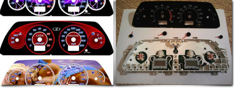 Другой вариант тюнинга включает в себя изменение дизайна шкалы приборов. Вы можете распечатать готовые решения на цветном принтере, приклеить их на жесткий картон и установить вместо старой шкалы. Необходимо учитывать, что освещение новой шкалы может отличаться от заводского, поэтому важно обратить внимание на цвет шкалы и материал, к которому она будет приклеена.