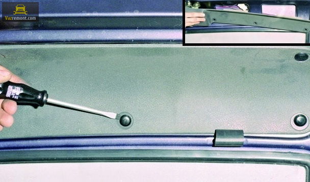 С помощью отвертки аккуратно подденьте пистоны, которые фиксируют обшивку багажника.