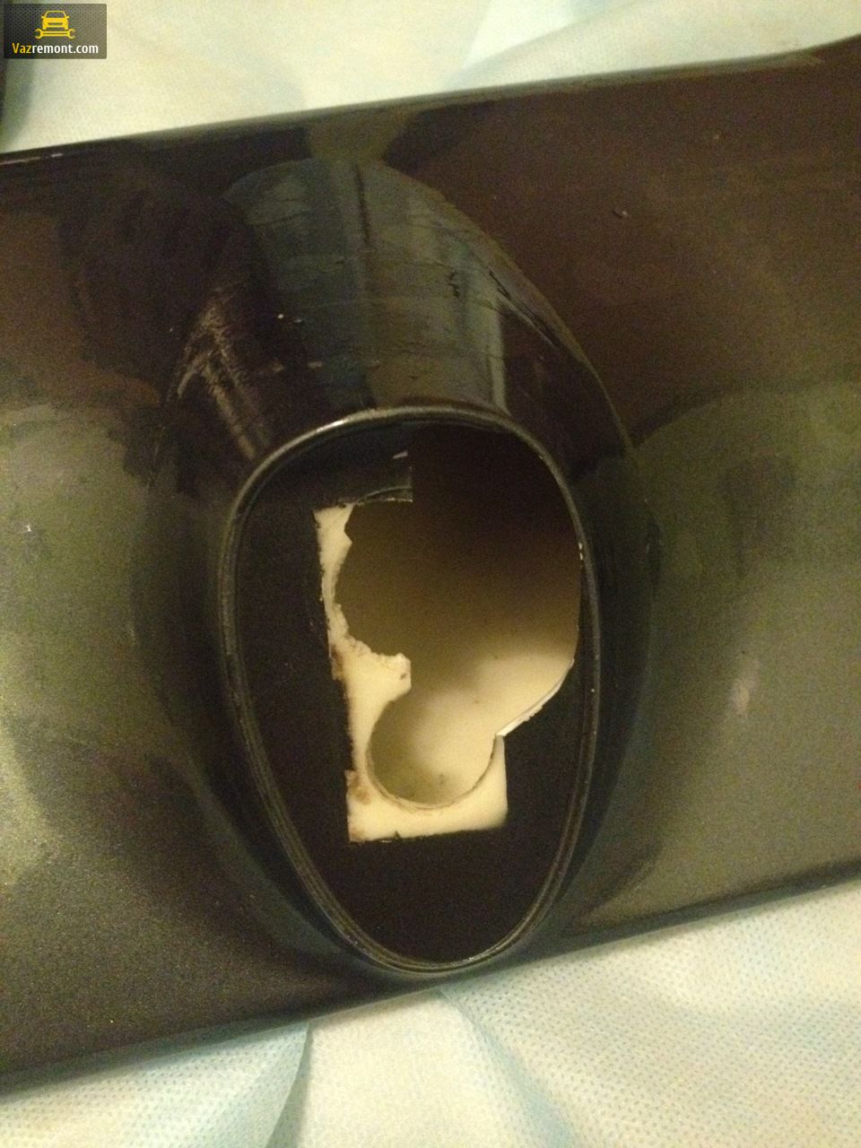При взаимодействии эпоксидной смолы с отвердителем происходит значительное нагревание. Если спойлер был защищен пленкой, она может прилипнуть к его поверхности. Поэтому важно предусмотреть вентиляцию для перегревающихся участков. В некоторых случаях для усиления конструкции заполняют эпоксидной смолой всю внутреннюю полость, а не только уязвимые места. После заливки излишки аккуратно спиливают и шлифуют.