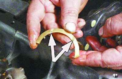 С передней стороны постели (со стороны привода распределительного вала) устанавливается сталеалюминиевое полукольцо (белого цвета), а с противоположной стороны — металлокерамическое (желтого цвета).