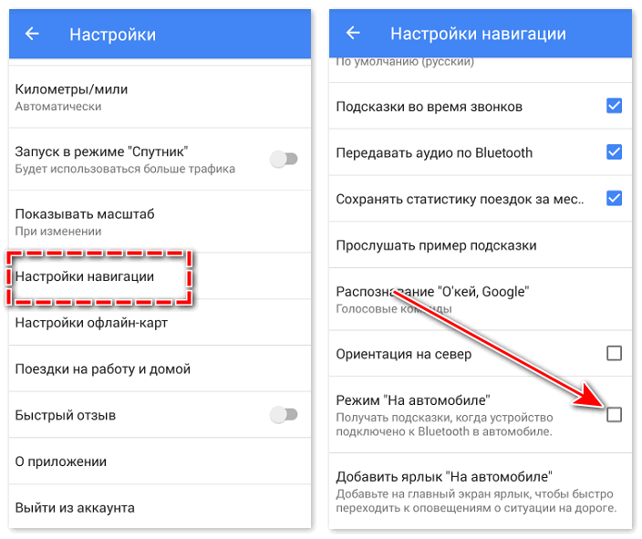 - Выбор транспортного средства. В разделе навигация укажите «автомобиль», чтобы программа подстраивалась под определенную скорость передвижения и выбирала дороги/шоссе для прокладывания маршрута.