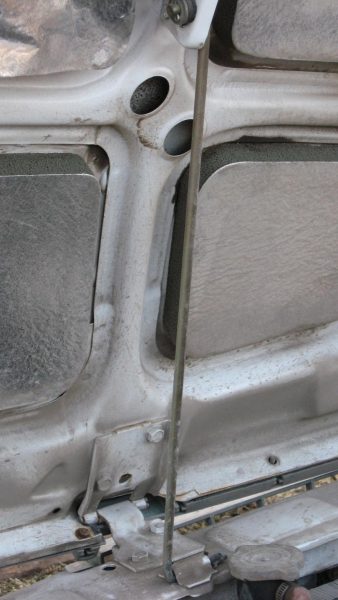 - Привод замка можно извлечь не через воздуховод, а через пространство между кузовом и капотом. В этом случае крышку моторного отсека нужно максимально приподнять, используя подходящий деревянный брусок, который предотвратит её возвращение на место. Чтобы не повредить лакокрасочное покрытие, брусок следует обернуть ветошью. После того как трос будет извлечён, останется лишь потянуть за него.