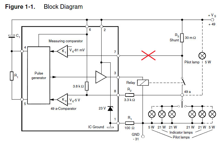 На изображении показана схема реле поворотников. Красным крестиком отмечено место, где необходимо разорвать цепь для корректной работы светодиодов в указателях поворота. Если же вас интересует оригинальная схема реле, просто проигнорируйте красную отметку.