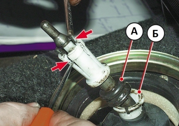 Для этого с помощью двух отверток аккуратно разведите лепестки верхней втулки и снимите её. Затем, приложив небольшие усилия, снимите втулки А и Б с рычага.