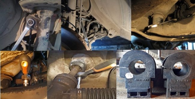 Затем проверьте состояние сайлентблоков, втулок и поперечного рычага. Используйте монтировку, чтобы надавить в местах соединений. Параллельно осмотрите герметичность амортизатора, пружину и опорный подшипник. Если вы обнаружите повреждения или деформации, примите решение о необходимости замены этих деталей.