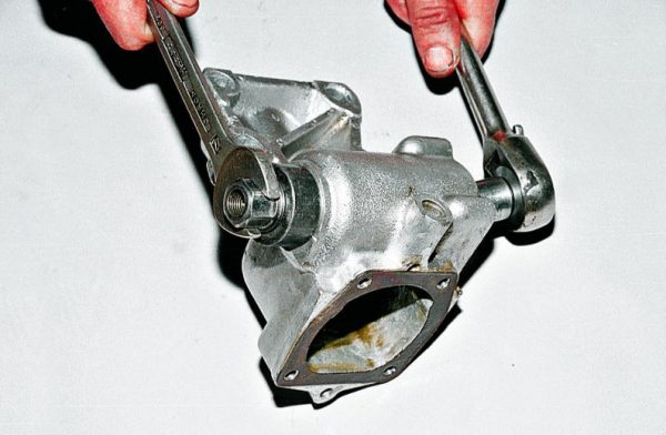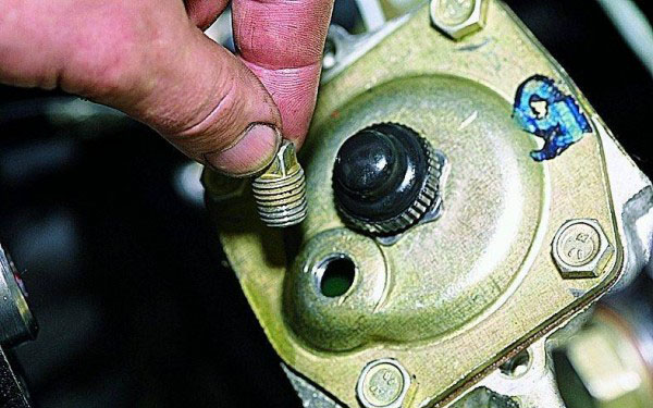 Затем выкручивают пробку маслозаливного отверстия и сливают масло из картера, после чего отворачивают регулировочную гайку и убирают стопорную шайбу.