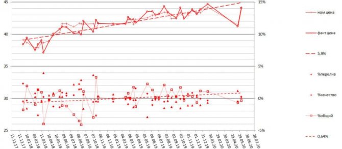 За последние 5 лет цена на топливо Лукойл постепенно росла, а средний уровень роста составил 4-8% в год: