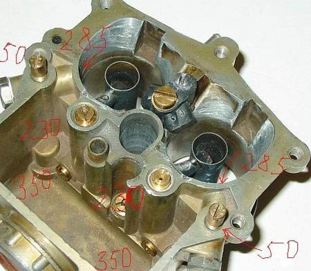 При разборке карбюратора следует обратить внимание на состояние жиклеров, при необходимости их следует промыть. Проверяется состояние поплавков (они бывают двух типов – латунные и пластиковые), осей заслонок, ускорительного насоса. Все поврежденные детали следует заменять новыми.