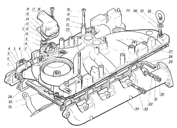 В корпусе поплавковой камеры расположены: два больших 6. и два малых диффузора 7, два главных топливных жиклера 28, два воздушных тормозных жиклера 21 главных дозирующих систем, две эмульсионные трубки 23, расположенные в колодцах, топливный 13 и воздушный жиклеры системы холостого хода, экономайзер и направляющая втулка 27, ускорительный насос 24 с нагнетательным и обратным клапанами.