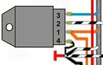 Данные недостатки устраняются путем замены штатного прибора на электронную конструкцию. В этом случае подключение реле поворотов осуществляется по стандартной схеме, показанной на рисунке. Контакт № 1 является положительным, второй контакт служит для подключения к переключателю поворотов, третий соединяется с контрольной лампочкой, а четвертый подключается к массе.