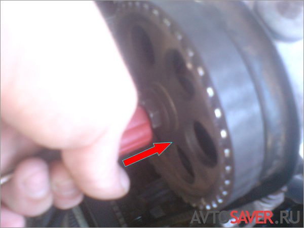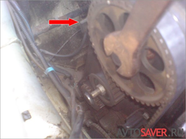 Сначала с помощью мощного ключа на 17 выставляем шестерню распредвала по метке. Это необходимо для того, чтобы «штырёк», расположенный на распредвале, не мешал снятию крышки.