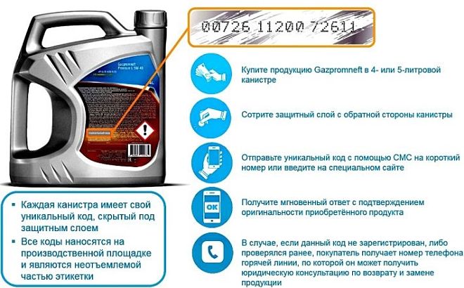 На обратной стороне этикетки канистры размещен уникальный код, который защищен специальным стираемым слоем. После приобретения канистры необходимо удалить защитное покрытие и увидеть код. Затем, посетив сайт Газпромнефть-СМ или отправив СМС на номер 3888, можно проверить подлинность кода. Система быстро распознает номер с канистры и информирует покупателя о том, является ли продукт оригинальным.