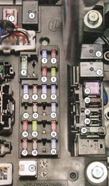 В моторном отсеке блок предохранителей расположен, как показано на рисунке.