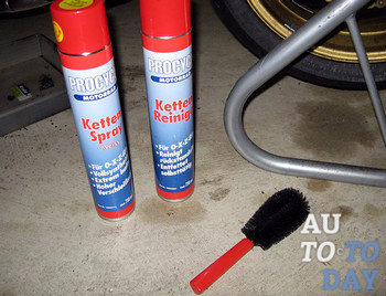 Прежде чем наносить смазку на цепь, ее следует тщательно очистить. Для этого вам понадобятся керосин или чистящее средство Motul C1 Chain Clean (это более дорогое решение), а также щетка или удобное устройство для мойки цепи «KETTENMAX». Этот простой набор поможет вам избавиться от накопившегося песка, грязи, пыли и масла на цепи мотоцикла. Начните вращать колесо и очищайте цепь до тех пор, пока она не станет чистой или не начнет вытекать чистый керосин. Ни в коем случае не включайте первую передачу и не используйте пальцы для доступа в труднодоступные места — это может привести к серьезным травмам!