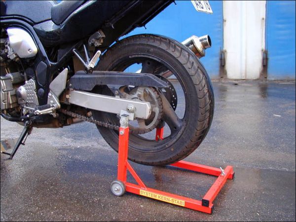 Чтобы начать работу с цепью, необходимо приподнять заднее колесо. Если у вас нет центральной подставки, можно воспользоваться задним подкатом или боковым домкратом. Затем заведите двигатель и переключите трансмиссию в нейтральное положение.