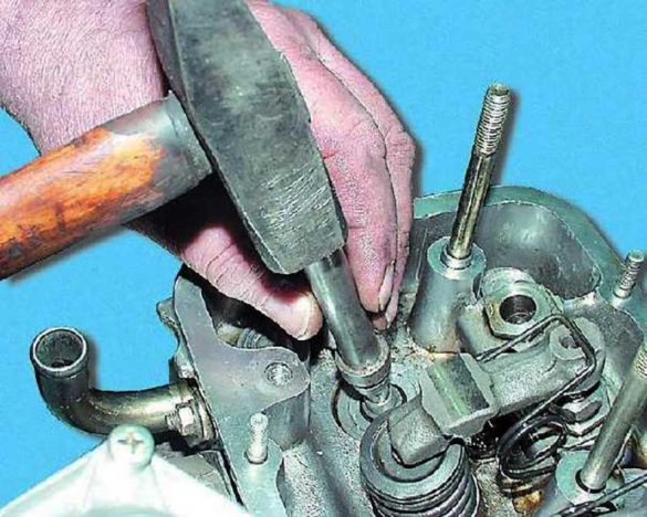 Снятая головка блока цилиндров удобно размещается на столе, после чего можно снять пружины с коромыслами (старайтесь не перепутать их местами). Затем с помощью съёмника разблокируйте клапаны и извлеките их, не забыв про «сухари» — маленькие полуцилиндры, которые вставляются в прорезь штока. Далее переверните головку так, чтобы камеры сгорания оказались сверху, подложите по краям деревянные бруски и выбейте оправкой все втулки. Удары следует наносить с умеренной силой, аккуратно и точно. В завершение тщательно очистите и протрите всю головку блока цилиндров от нагара и отложений.
