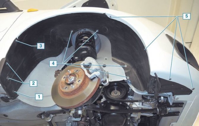 - Затем нужно демонтировать переднее правое колесо. После чего снять подкрылок. Для его снятия нужно аккуратно открутить 12 болтов по периметру подкрылка.