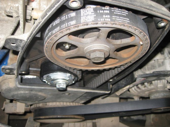 - Далее ремень надевается на шкивы обеих распредвалов.