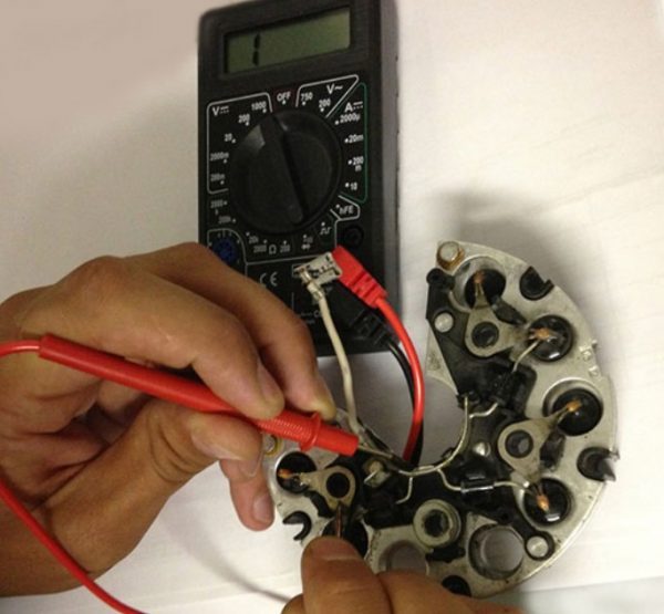 Диодный мост генератора состоит из нескольких выпрямительных диодов, на которые поступает переменное, а выходит постоянное напряжение. От исправности этих элементов напрямую зависит работоспособность самого генератора. Иногда диоды выходят из строя и нуждаются в проверке и замене. Диагностика проводится при помощи мультиметра или автомобильной лампочки на 12 В.