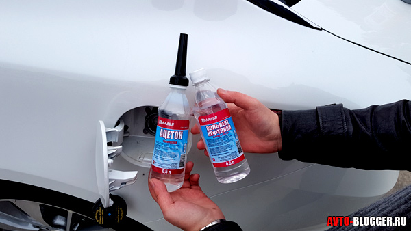 Поэтому давайте рассмотрим альтернативный вариант: ацетон и растворитель. Второй вариант, конечно, менее эффективен, так как октановое число растворителя составляет всего 60-70, в то время как у ацетона — около 100.
