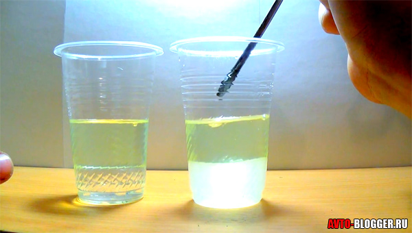 Вода обладает высокой плотностью, поэтому она оседает на дно и не смешивается с бензином. Спирт имеет немного большую плотность, чем бензин, и располагается между водяной пробкой и топливом. Таким образом, он хорошо смешивается и, если говорить образно, образует нечто вроде водки (при использовании этилового спирта).