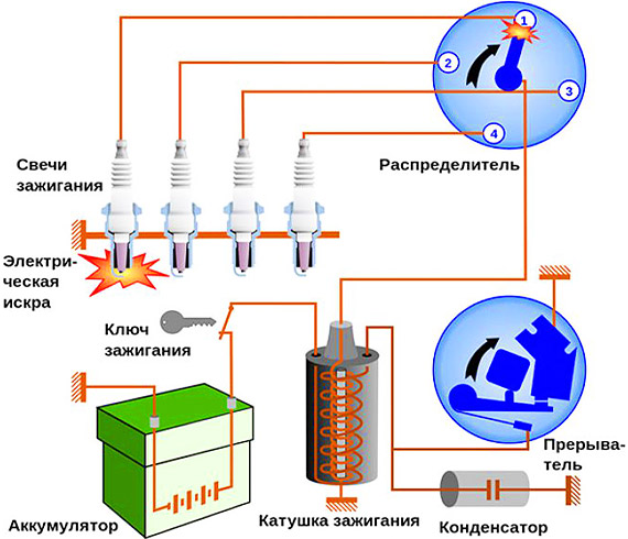 - Обрыв провода, который связывает подвижный диск прерывателя с корпусом.