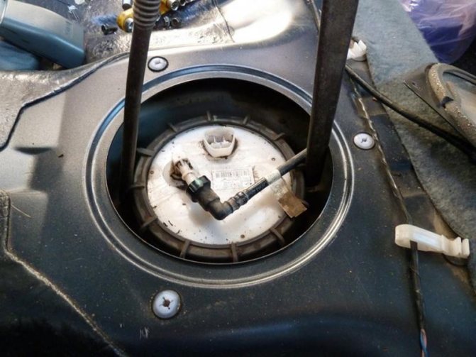 Чтобы горючее не пролилось и не заляпало всё вокруг — запах бензина может долго не выветриться из машины — надо возле модуля (белого пластикового корпуса с крышкой-ободком по окружности) поставить пустую ёмкость, в неё опустить подающий топливный шланг.
