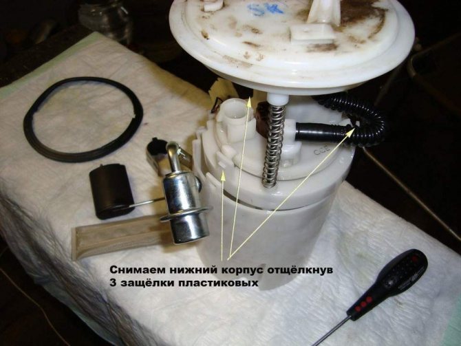 - Нажимают сразу на 3 зажима, чтобы вытащить наверх бензонасос с обоими фильтрами из пластикового корпуса модуля.