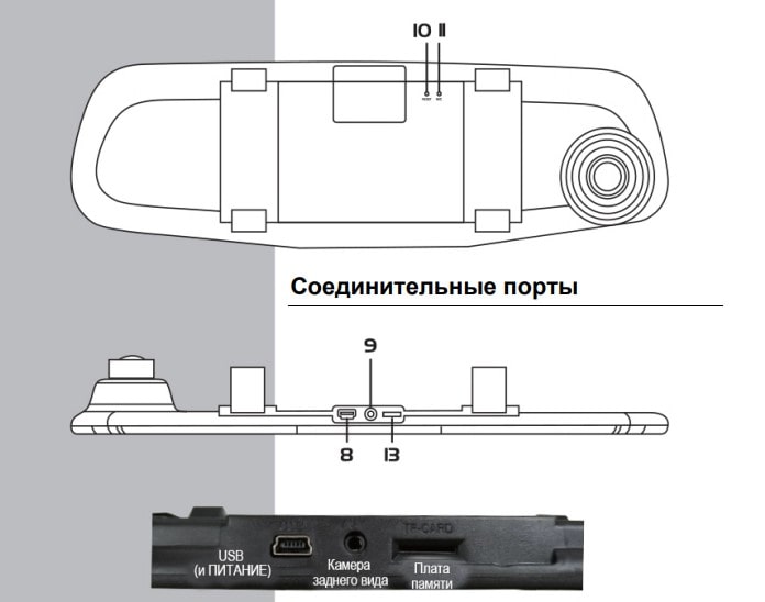В этой части зеркала мы можем видеть экран, где отображается видео. Появляется оно тогда, когда девайс включен. Повернув зеркало мы можем увидеть мини юсб порт для зарядки, слот для карты памяти- micro sd, код для подключения камеры заднего вида.