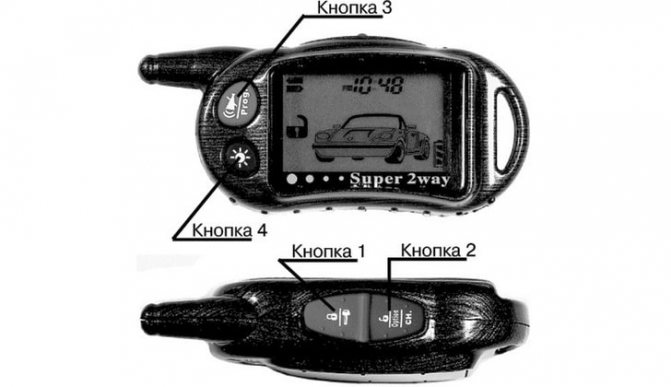 - Двух брелков, которые могут применяться для управления функциями. Основной брелок с четырьмя кнопками, жидкокристаллическим экраном может работать в две стороны. В нем меется два сигнализатора – звуковой и вибрационный, которые используются для информирования владельца о различных событиях при работе или настройке системы. И дополнительный с тремя кнопками, который работает только в одном направлении.