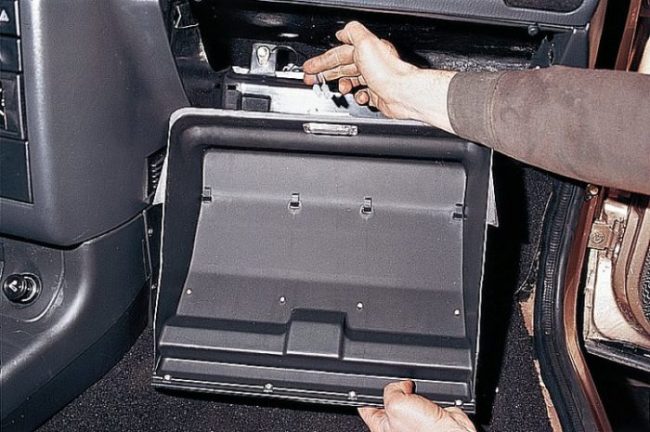 Далее демонтируется бардачок. Для этого сначала снимается его нижняя часть, затем крышка с лампочкой. После этого откручиваются шесть саморезов, которые крепят верхнюю часть. Немного нажав и повернув, верх бардачка можно опустить и извлечь.