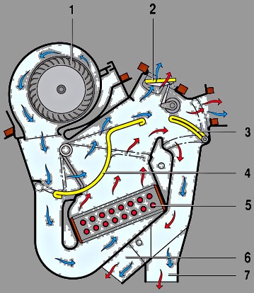 - Распределительная заслонка, которая направляет воздушные потоки к центральным и боковым дефлекторам, а также в верхнюю и нижнюю зоны салона.