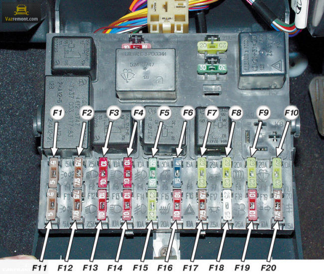 - Прямоугольники розового цвета — 10-амперные предохранители;