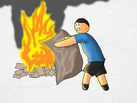 Если у вас нет под рукой огнетушителя, попробуйте накрыть пламя плотной тканью или одеялом, чтобы перекрыть доступ кислорода. Это может помочь остановить горение, но только если пламя не слишком велико.
