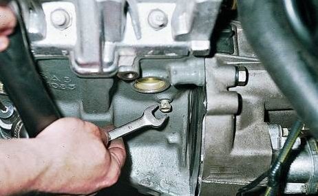 Затем выкручиваются гайка и три болта крепления задней крышки, делается это ключом на «10». После эта крышка извлекается, обеспечивая доступ к болтам крепления помпы.