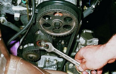 Ключом на «17» сначала ослабляется, а затем и вовсе выкручивается гайка натяжного ролика. Затем ролик снимается. Его тоже следует проверить на износ – люфта в нем не должно быть, а вращаться он должен без заеданий.