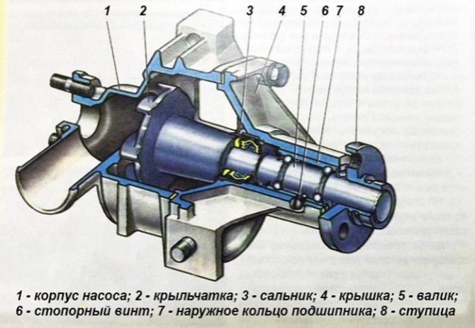 Чтобы понимать причины неисправностей насоса, нужно знать его устройство. Деталь состоит из следующих основных элементов, выполняющих определённые функции: