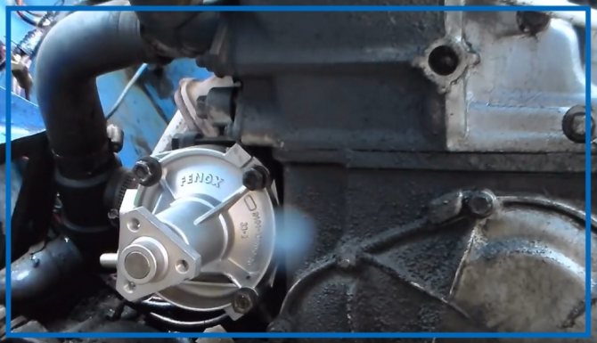 - Новая помпа ставиться на место так, чтобы маркировка, нанесенная на торцевой части корпуса, находилась вверху. Затягивать болты крепления насоса нужно хорошо, но аккуратно, поскольку вкручиваются они в блок, сделанный из алюминия.