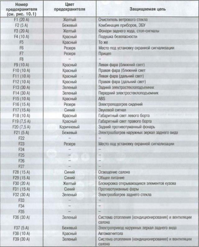 - F5 – питающая линия салонных устройств защиты с плавкими вставками F11, F23-F27, F34, F39 (15А);