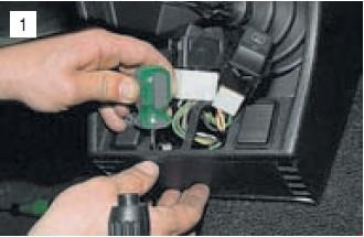 Для проверки и замены предохранителя цепи противотуманного света, аккуратно поддев отверткой, извлекаем два центральных переключателя из панели радиоприемника.