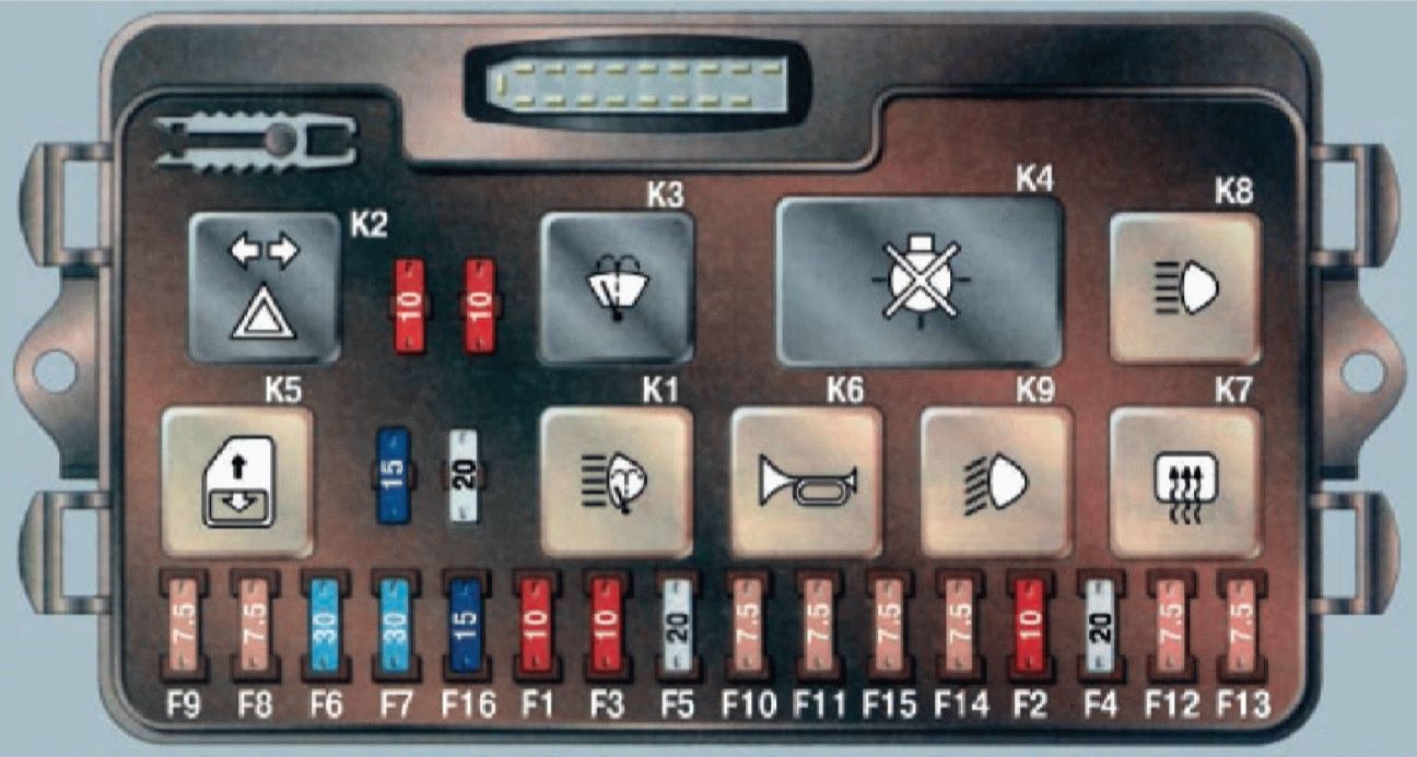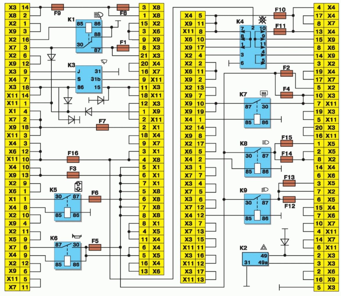 K1 — реле активации очистителей фар; K2 — реле, отвечающее за прерывание работы указателей поворота и аварийной сигнализации; K3 — реле стеклоочистителя лобового стекла; K4 — реле, контролирующее исправность ламп; K5 — реле, активирующее стеклоподъемники; K6 — реле, включающее звуковые сигналы; K7 — реле, отвечающее за включение электрообогрева заднего стекла; K8 — реле, активирующее дальний свет фар; K9 — реле, включающее ближний свет фар; F1-F16 — предохранители, защищающие цепи от перегрузок.