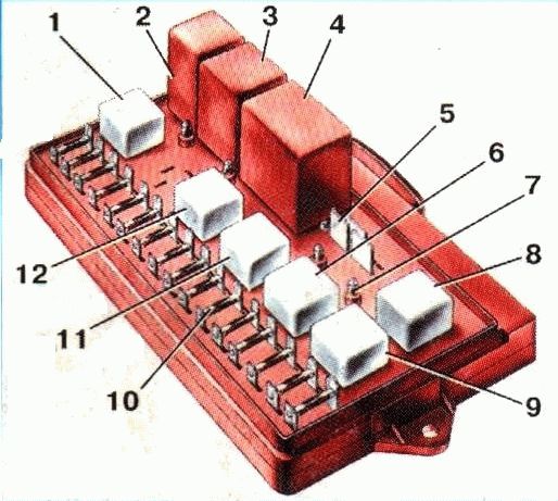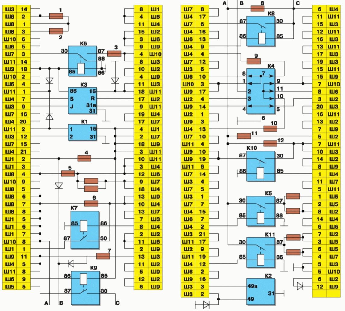 K1 — реле, отвечающее за работу омывателя заднего стекла; K2 — реле-прерыватель для указателей поворота и аварийной сигнализации; K3 — реле стеклоочистителя; K4 — реле, контролирующее исправность ламп (внутри представлены контактные перемычки, которые устанавливаются вместо реле); K5 — реле, активирующее дальний свет фар; K6 — реле для включения фароочистителей; K7 — реле питания стеклоподъемников; K8 — реле, отвечающее за звуковой сигнал; K9 — реле, активирующее электродвигатель вентилятора системы охлаждения двигателя; K10 — реле, включающее обогрев заднего стекла; K11 — реле, отвечающее за ближний свет фар.
