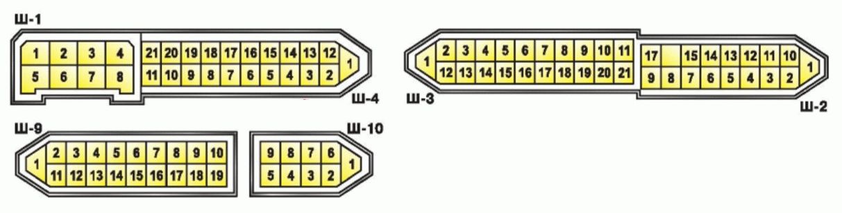 Условная нумерация разъемов в колодках монтажного блока ВАЗ 2109-09-099 для подключения проводов в салоне: Ш9 — колодка, соединяющаяся с задним жгутом проводов; Ш1-Ш4 — колодки, соединяющиеся с жгутом проводов панели приборов.