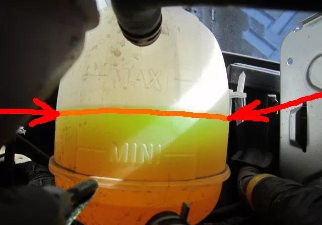 Слишком высокий уровень может привести к вытеканию из бачка некоторой части антифриза.