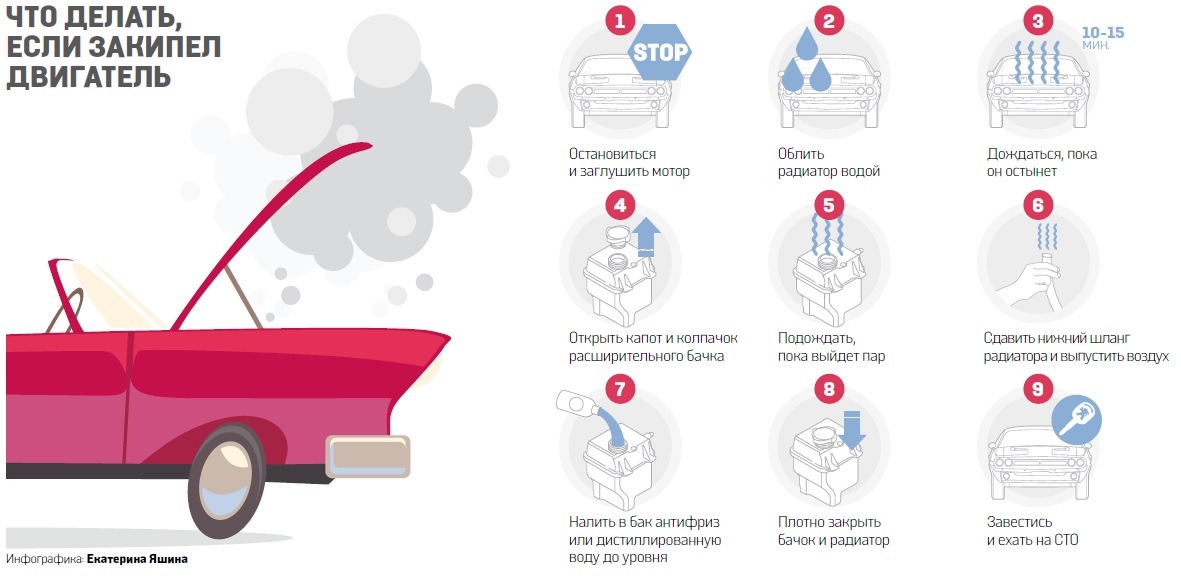 Во-первых, категорически нельзя открывать пробку радиатора или расширительного бачка. Поскольку кипение происходит в блоке цилиндров, открытый бачок может вызвать мощный выброс кипящей жидкости, что может привести к ожогам рук и лица.