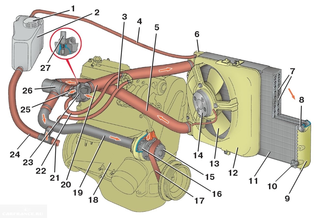 1 – пробка для расширительного бачка; 2 – расширительный бачок; 3 – шланг для отвода жидкости из патрубка; 4 – шланг, соединяющий радиатор с расширительным бачком; 5 – шланг, отводящий жидкость от радиатора; 6 – бачок, расположенный слева от радиатора; 7 – алюминиевая трубка; 8 – система заглушек; 9 – бачок, находящийся справа от радиатора; 10 – пробка для слива; 11 – центральная часть радиатора; 12 – кожух электрического вентилятора; 13 – пластиковые лопасти электрического вентилятора; 14 – электрический мотор; 15 – зубчатый шкив насоса; 16 – крыльчатка насоса; 17 – ремень привода распределительного вала; 18 – блок двигателя; 19 – насосная труба; 20 – шланг радиатора с подводящей функцией; 21 – шланг радиатора отопителя для отвода; 22 – шланг, подводящий охлаждающую жидкость к дроссельному патрубку; 23 – выпускной патрубок; 24 – шланг для заправки; 25 – шланг радиатора отопителя с подводящей функцией; 26 – термостат; 27 – датчик температуры охлаждающей жидкости; 28 – датчик уровня охлаждающей жидкости.