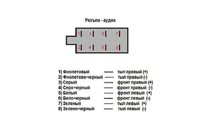 Распиновка фишки магнитолы, предназначенной для подключения колонок, производится следующим образом: